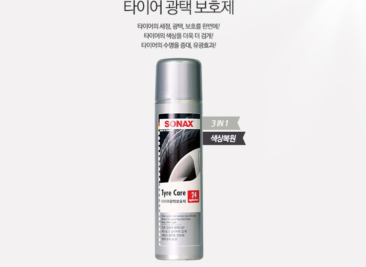 타이어 광택 보호제는 타이어 색상을 더 검게해주고 유광효과를 줍니다. 또한 타이어 보호 성분을 담고있어 수명을 더 길게 가져가실수도 있습니다.