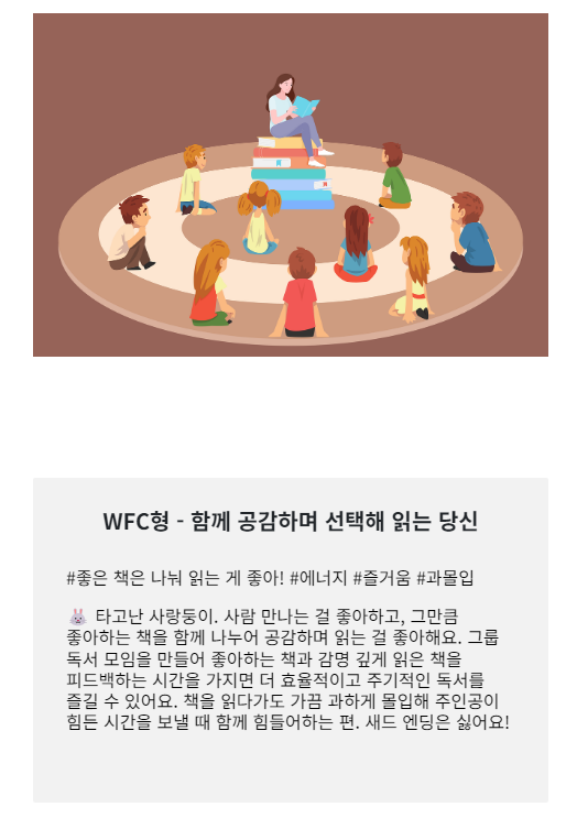 저의 경우엔 WFC형이 나왔는데요. 함께 공감하며 선택해 읽는 사람으로 분류됐습니다. 타고난 사랑둥이로 사람 만나는 것을 좋아하는 타입이 똑같네요.